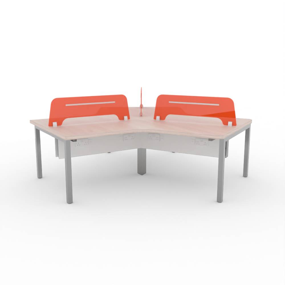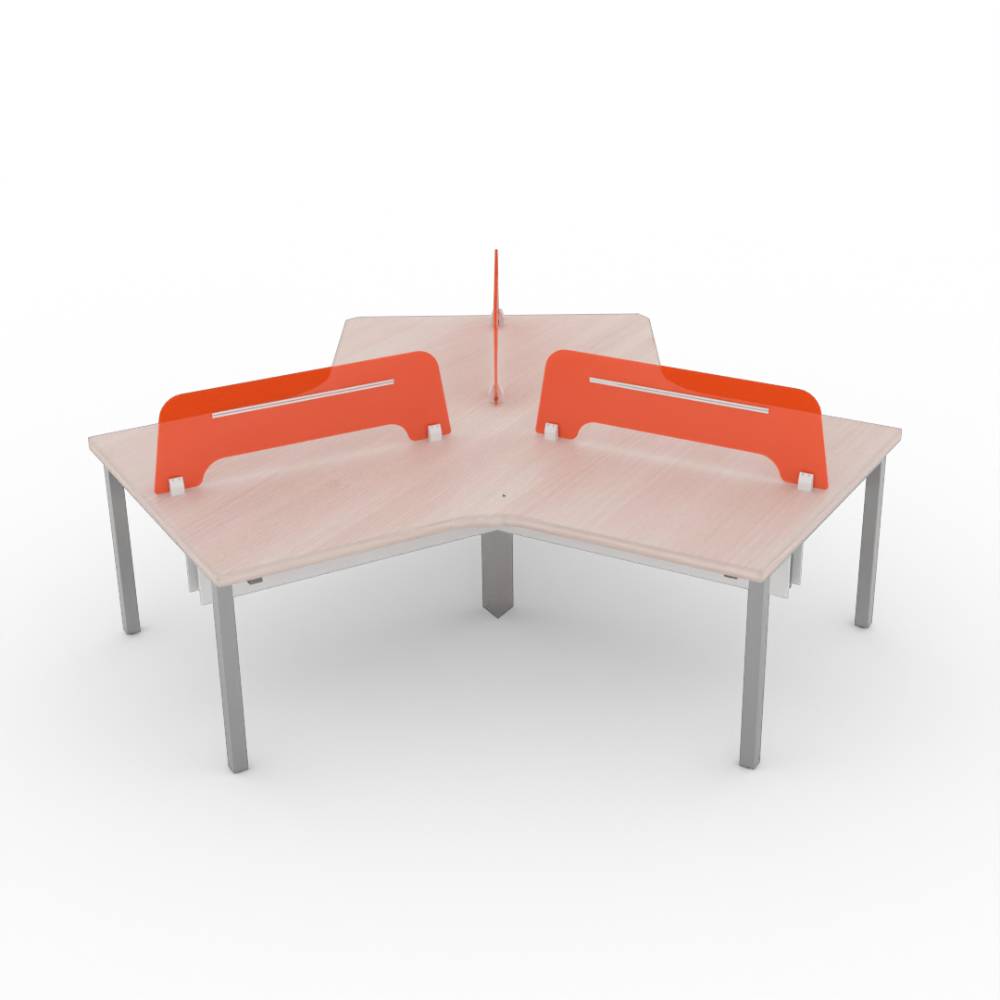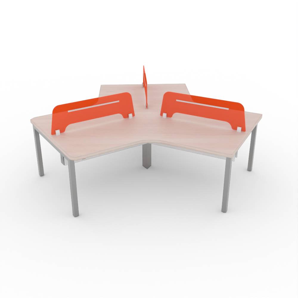 Three Person Shared workstation with orange dividers and black chairs.cross-shaped office workstation with four laptops, privacy dividers, black chairs.Office furniture setup a long shared desk with three laptops