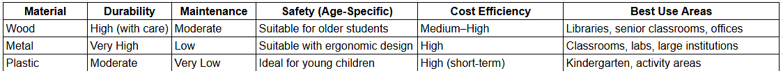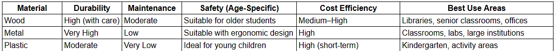 There is no single “best” option among school furniture materials. Wooden school furniture offers comfort and aesthetics but requires higher maintenance. Metal school furniture delivers strength, longevity and cost efficiency, making it ideal for high-usage classrooms. Plastic school furniture excels in safety and ease of handling for young children but has limitations in durability.